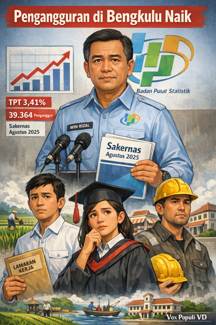 TNews, OPINI – Di tengah gencarnya elite daerah Bengkulu mengampanyekan keberhasilan pembangunan dan pertumbuhan ekonomi, data resmi Badan Pusat Statistik justru membuka kenyataan yang berlawanan. Survei Angkatan Kerja Nasional (Sakernas) Agustus 2025 mencatat jumlah angkatan kerja Bengkulu meningkat menjadi 1.154.698 orang, naik 18.125 orang dibandingkan tahun sebelumnya. Namun peningkatan ini tidak diiringi penciptaan lapangan kerja yang sepadan. Sebaliknya, jumlah pengangguran justru bertambah menjadi 39.364 orang, dengan Tingkat Pengangguran Terbuka (TPT) naik ke angka 3,41 persen.