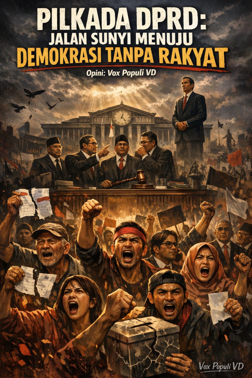 TNews, OPINI – Wacana mengembalikan pemilihan kepala daerah kepada DPRD terdengar seperti solusi. Tetapi dalam sejarah demokrasi, “solusi” semacam ini sering kali menjadi awal masalah yang lebih besar. Bahasa yang dipakai rapi: efisiensi, stabilitas, penghematan anggaran, meredam konflik. Namun di balik seluruh istilah teknokratis itu, tersembunyi satu fakta politik yang telanjang: kekuasaan sedang ditarik menjauh dari rakyat.