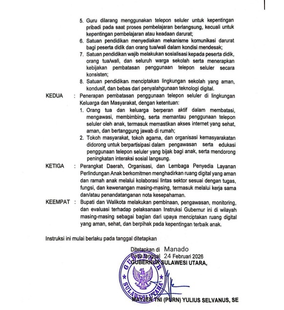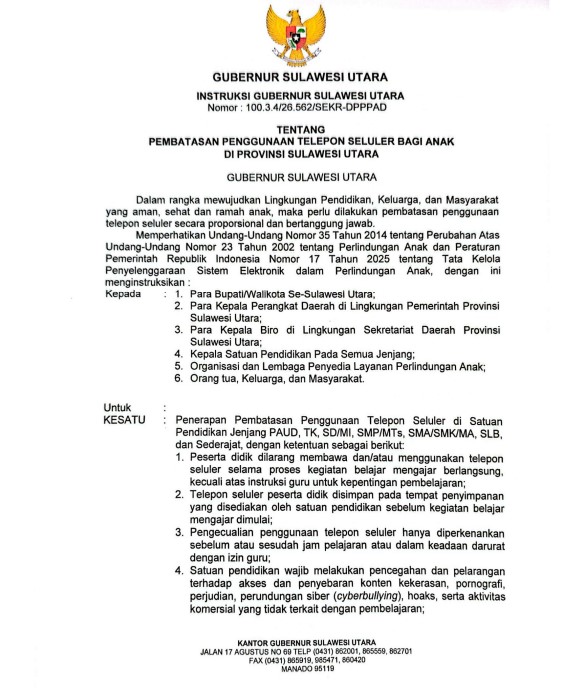 TNews, MANADO – Pemerintah Provinsi Sulawesi Utara menerbitkan kebijakan pembatasan penggunaan telepon seluler bagi anak-anak, khususnya di lingkungan pendidikan. Kebijakan tersebut tertuang dalam Instruksi Gubernur Sulawesi Utara Nomor 100.3.4/26.562/SEKR-DPPPAD yang ditandatangani Gubernur Sulut Yulius Selvanus.