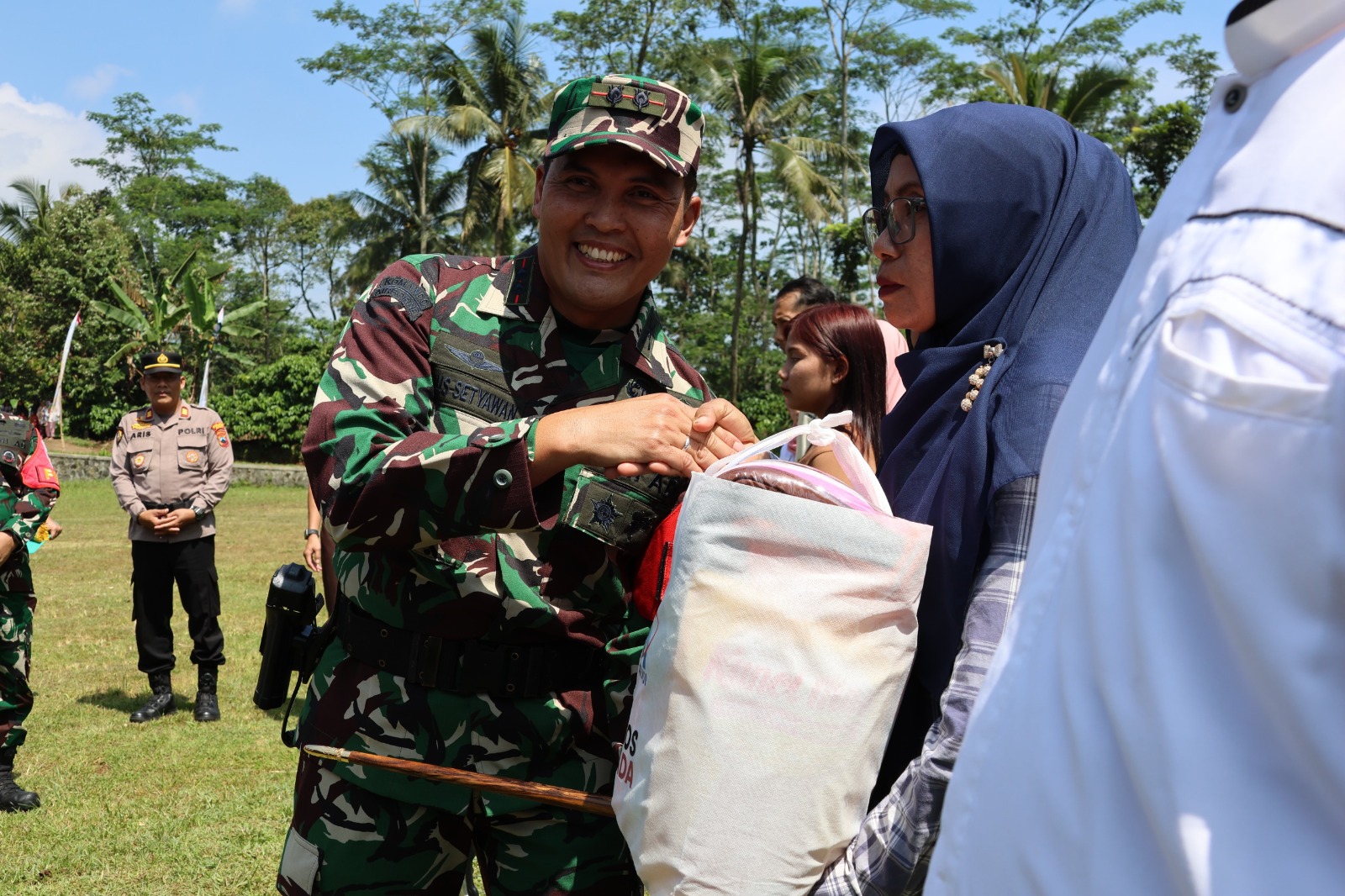Pada kesempatan yang sama, satgas TMMD berkolaborasi dengan dinsos dan Baznas turut membagikan ratusan paket bansoso kepada wrga kurang mampu di Lokasi TMMD. Secara simbolis bantuan di serahkan oleh jajaran Forkompimda kepada perwakilan Warga.